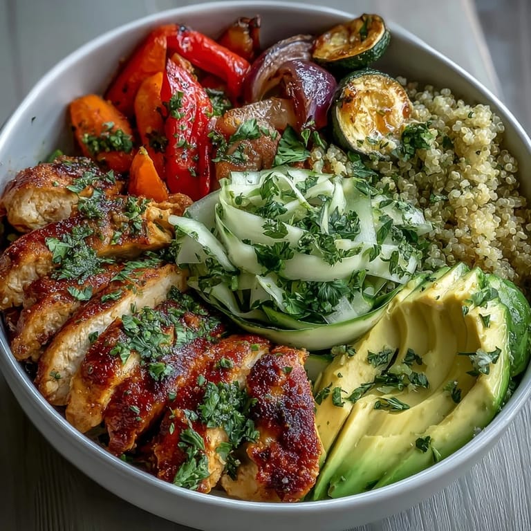 The order you layer everything matters more than you'd think. Starting with quinoa creates a sturdy base that won't tip over when you add the heavier vegetables. Then the warm roasted vegetables go on top, and the heat gently softens the greens and cucumber just enough. The chicken adds protein and substance, the lemon salad brings brightness right before the end, and the avocado is your final note—creamy and cooling. It's not just throwing ingredients together; it's orchestrating flavors and textures so each bite feels balanced and intentional.